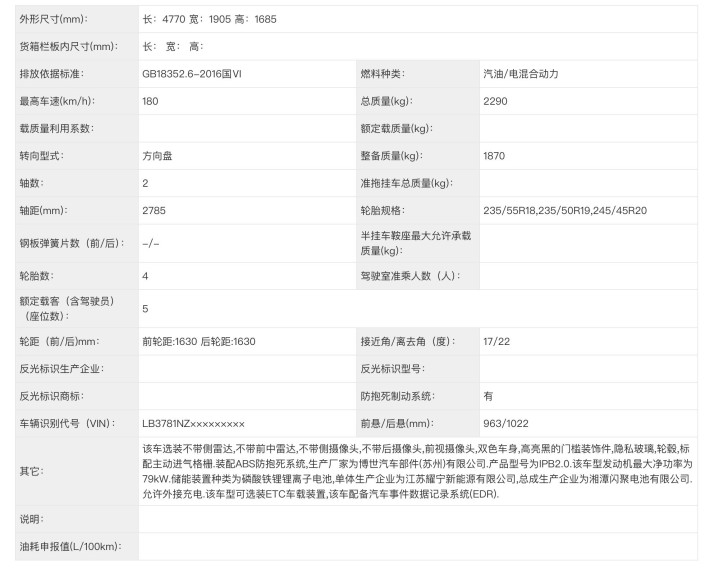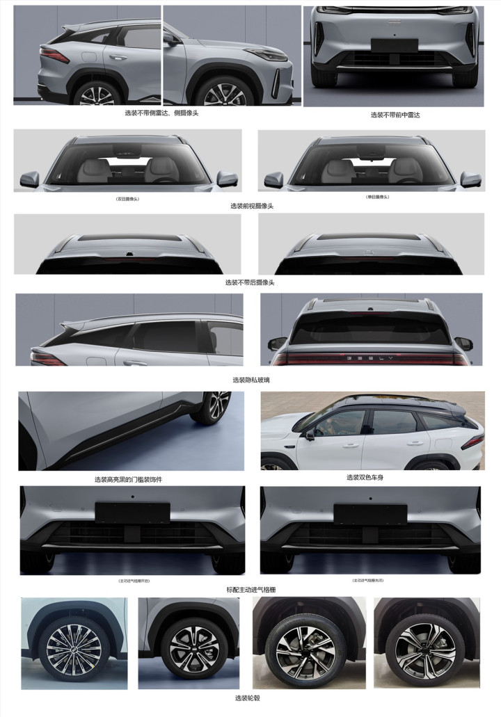 动力总成方面,全系搭载EM-i,也就是1.5L自然吸气发动机和单挡DHT变速箱,发动机输出功率为82千瓦,前驱电机预计160kW,这些都是吉利的成熟技术。这次申报的电池组容量有18.4度电和29.8度电两种,对应的纯电续航里程为101公里和155公里,亏电油耗为4.69-4.73升,全系都符合明年的5%购置税减免政策。